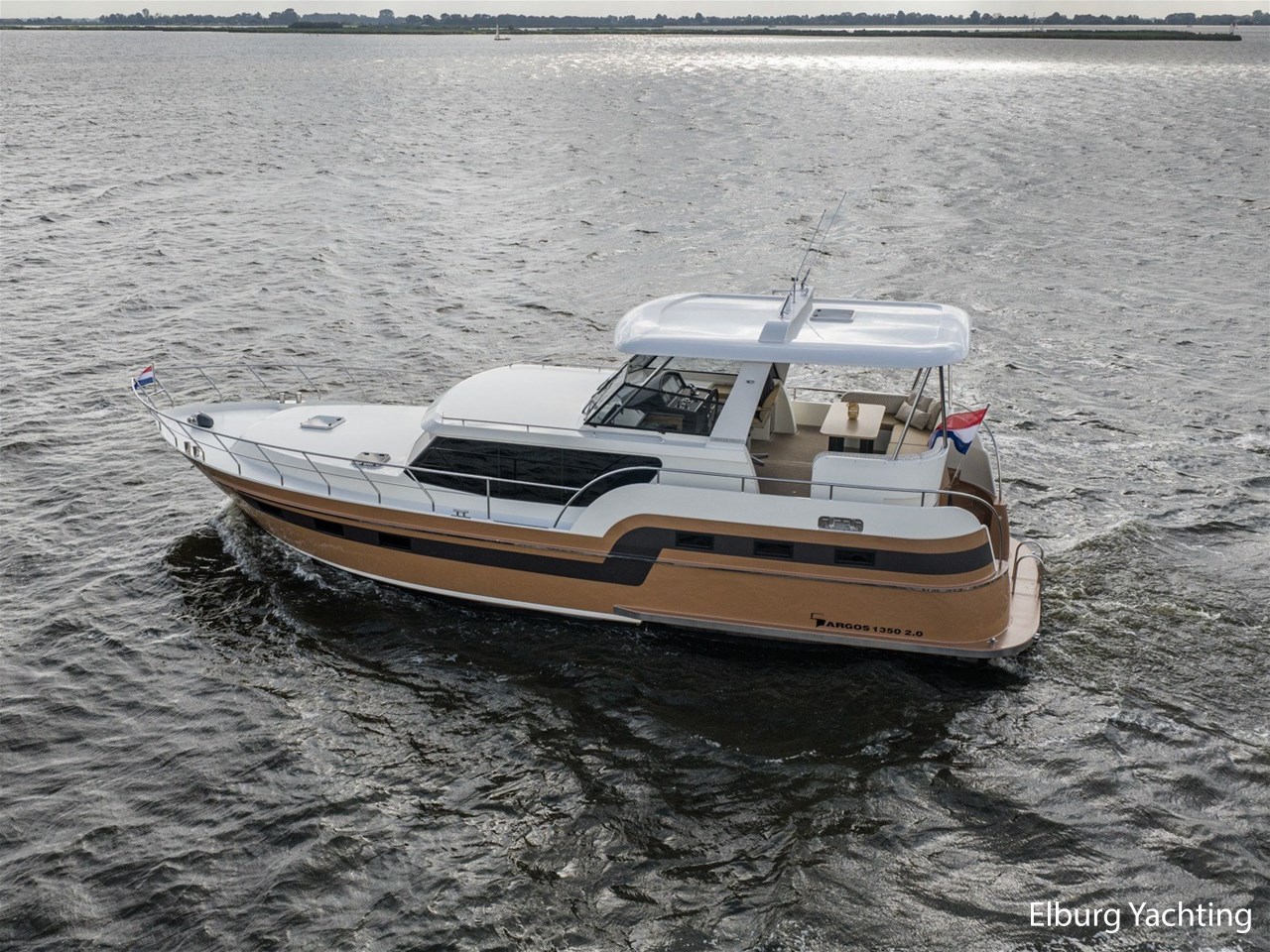 Prachtige, moderne Argos Line 13.50 - 2.0 aangeboden door haar eerste Nederlandse eigenaar. Dit prachtige exemplaar is gebouwd door de Argos Jachtwerf te Sneek en is getekend door Vripack design eveneens uit Sneek. Tijdens het bouwproces is er met veel zaken rekening gehouden, het jacht moest modern worden met een praktische indeling (waaronder drie volwaardige hutten en diverse comfortabele zitplaatsen). Tevens moest het jacht geschikt zijn voor een langer verblijf aan boord, hierdoor is er dubbelglas geplaatst met een fijne centrale verwarming. Tevens was het van belang dat het jacht een warme uitstraling kreeg, zo heeft ze de prachtige tweekleurige romp gekregen in combinatie met een uiterst modern interieur waarbij gebruikgemaakt is van uitsluitend kwaliteitsmaterialen. Het jacht is voorzien van een 'zwevende hardtop' over het achterdek waar men heerlijk uit de zon kan zitten. De salon is voorzien van twee fraaie zitgelegenheden met een praktische open keuken. Voorin zijn twee slaapgelegenheden gesitueerd met sanitair en in het achterschip is de eigenaarshut gesitueerd met eigen sanitaire ruimte.